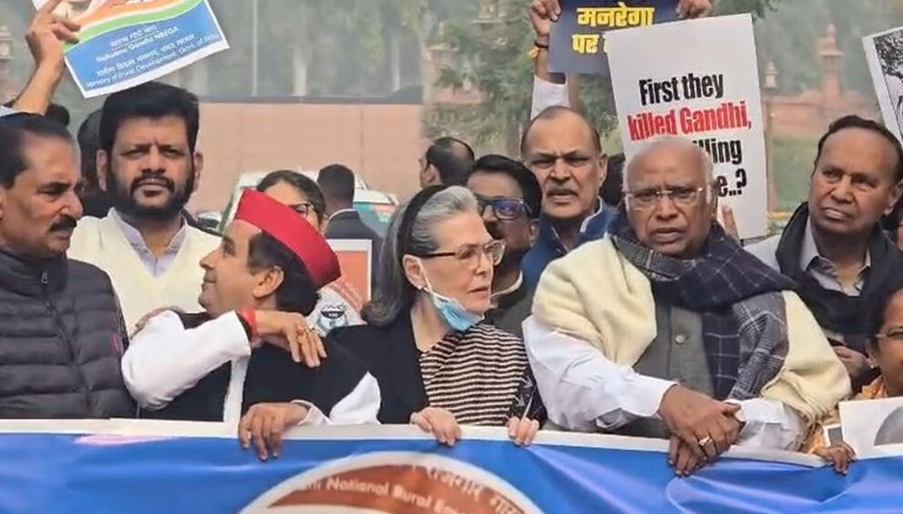 नई दिल्ली। हाथों में महात्मा गांधी की तस्वीरें लेकर, गुरुवार को कई विपक्षी सांसदों ने संसद भवन परिसर के अंदर सरकार के जी राम जी बिल के खिलाफ विरोध मार्च निकाला और इसे वापस लेने की मांग की। उन्होंने प्रेरणा स्थल पर गांधी प्रतिमा से मकर द्वार तक मार्च किया और सरकार के खिलाफ नारे लगाए। कांग्रेस अध्यक्ष मल्लिकार्जुन खडग़े, एआईसीसी महासचिव के सी वेणुगोपाल, डीएमके की के कनिमोझी, टीआर बालू, ए राजा, आईयूएमएल के ईटी मोहम्मद बशीर, शिवसेना (यूबीटी) के अरविंद सावंत और आरएसपी के एन के प्रेमचंद्रन सहित अन्य लोगों ने विरोध प्रदर्शन में हिस्सा लिया। वेणुगोपाल ने पत्रकारों से कहा, आज संसद में लोकतंत्र की हत्या हो रही है। नरेगा से महात्मा गांधी का नाम हटाकर वे लोकतांत्रिक मूल्यों के साथ-साथ राष्ट्रपिता की विचारधारा को भी खत्म करने की कोशिश कर रहे हैं। वरिष्ठ कांग्रेस नेता सोनिया गांधी विरोध कर रहे सांसदों के साथ शामिल हुईं और मकर द्वार पर प्रदर्शन में हिस्सा लिया। यूपीए-काल के मनरेगा की जगह लेने वाले विकसित भारत गारंटी फॉर रोजगार एंड आजीविका मिशन (ग्रामीण) (वीबी-जी राम जी) बिल पर संसद में बहस हो रही है।