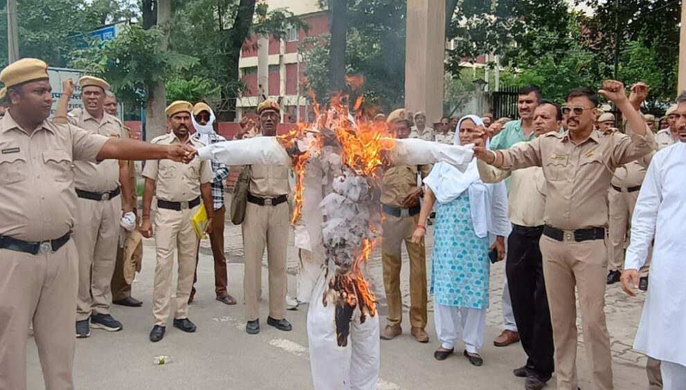 ग्रामीण चौकीदारों ने फूंका हरियाणा के मुख्यमंत्री का पुतला